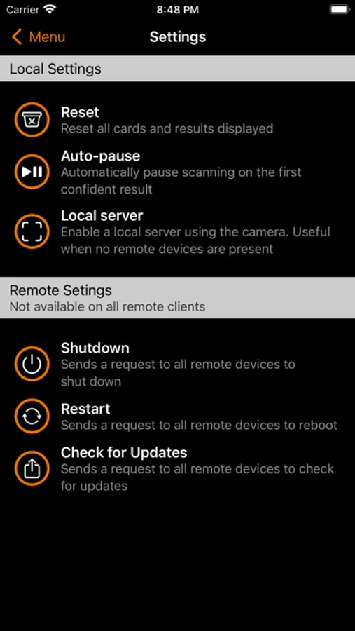 3. Client - In this mode, Abra will not scan the deck but will instead automatically detect and connect to a remote scanning server device on the same WiFi network. The Abra client will display the results of and configure that remote server.