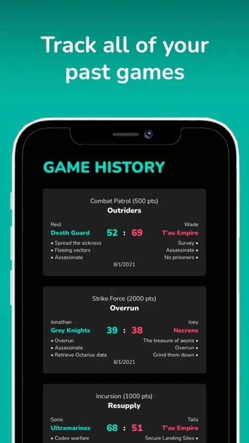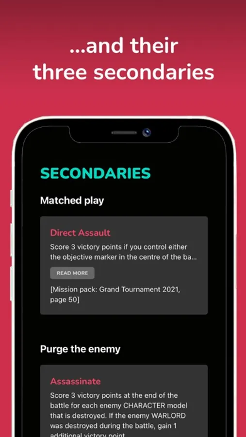 Supports matched play missions for the 9th edition of Warhammer 40k. The app comes with missions and objectives from Warhammer 40k Core book*, Chapter Approved: Grand Tournament 2021*, War Zone Nachmund: Grand Tournament 2022*, War Zone Nephilim: Grand Tournament 2022*, War Zone Arks of Omen: Grand Tournament 2023* and every new faction codex released. The data and rules for the game are not included within the app. Please refer to the Warhammer 40k Core book* for official game rules.