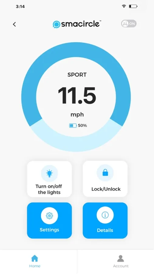 1. After registering and logging in, users can connect to the vehicle via Bluetooth in the main interface, and after the successful connection, the users can see the current vehicle speed, battery level and other information, and can also complete the operations of switching the vehicle gears, switching lights and locking the vehicle in the main interface.