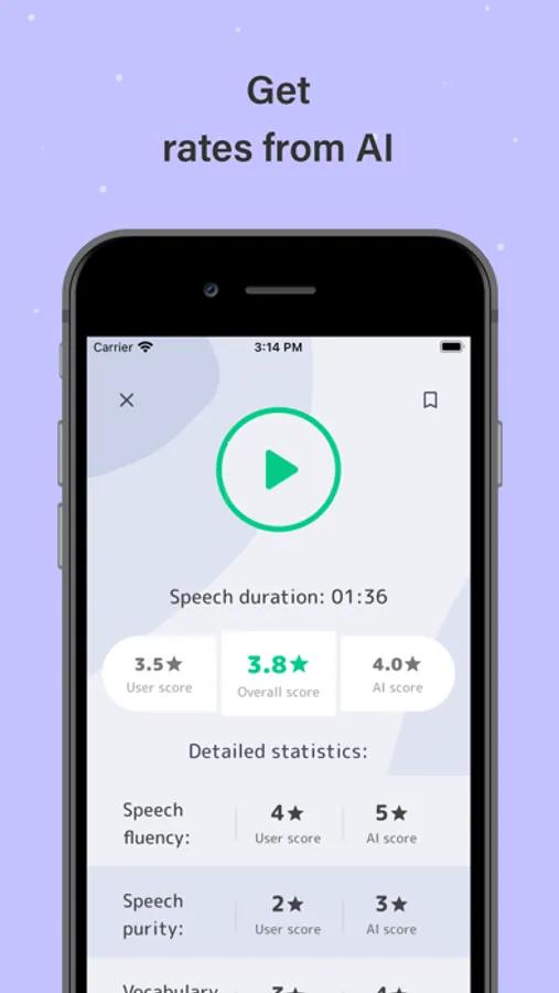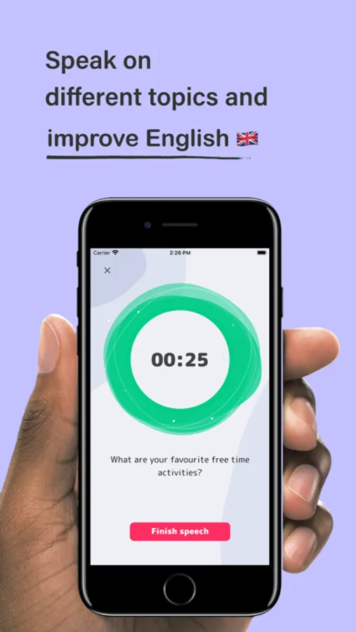 Our English speaking offline app includes hundreds of interesting questions and topics for your speeches. At first, the application generates a random topic and you can either skip it or start practicing. While you're speaking on the generated topic we record your voice so that the AI can analyze it after completion. After that you should listen to your speech and rate yourself on several criteria: speech fluency, speech purity, vocabulary vastness and grammar. At the same time, Artificial Intelligence analyzes your speech and also rates it. In the end, our English speaking practice app gives you the average result of your own and AI rates.