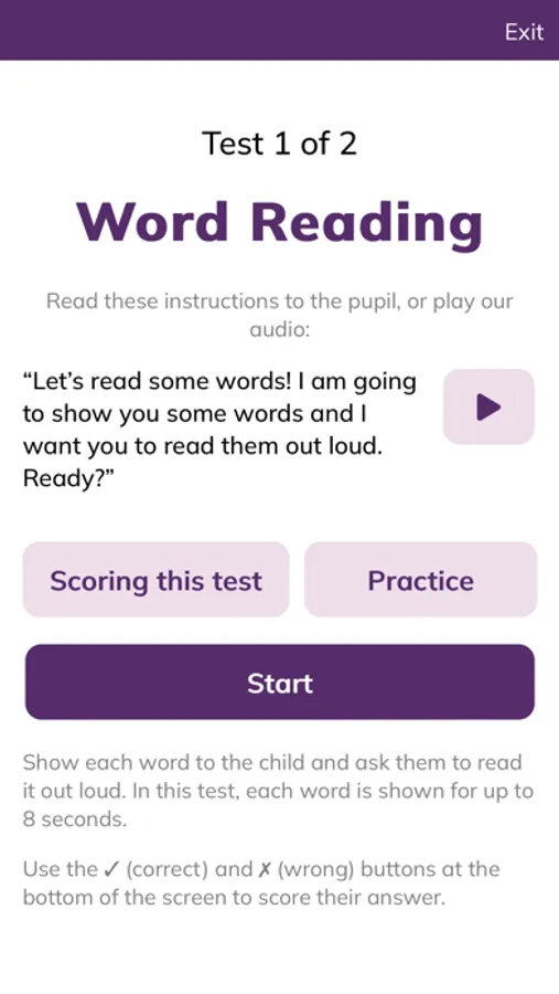 ReadingScreen assessments consist of two tests measuring different reading skills. The first presents pupils with up to 60 individual words of increasing complexity. The second presents them with up to 34 nonwords. The pupil is asked to read each word or nonword out loud and their responses are marked for accuracy by the adult conducting the assessment. If they get 15 answers in a row incorrect, the test ends and they move onto the next test. Each assessment should take 10 minutes or less to complete. Assessments can be interrupted if necessary and will resume from the beginning of the most recent test.