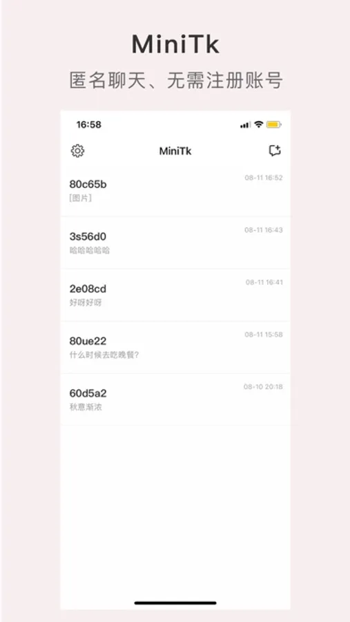MiniTk 是一款极简的匿名聊天软件。无需注册账号,即可开启聊天。支持发送图片、文字。
