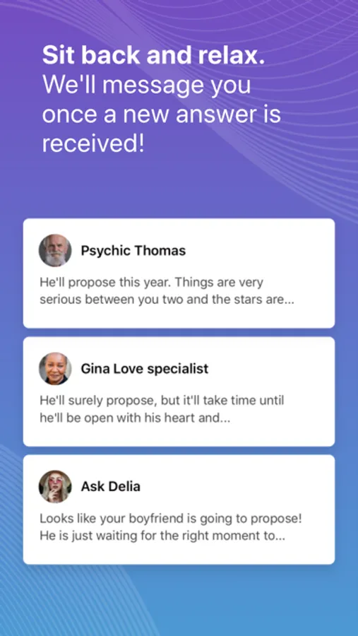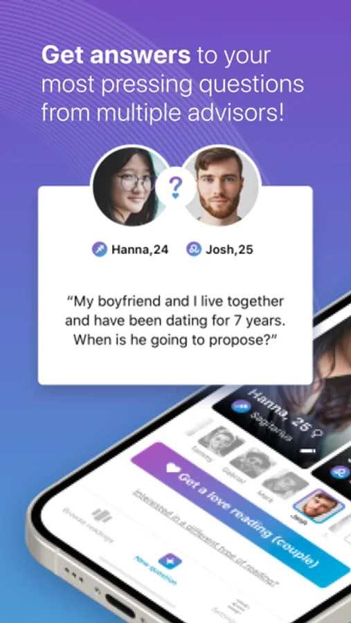 With Purple Tides, you can ask the same question to multiple psychic advisors at once. Send your question to two, three, five, or even ten experts and get a panoramic view of what lies ahead. Each Purple Tides advisor specializes in different psychic reading styles. At the tap of a finger, you can access all their psychic skills and talents.