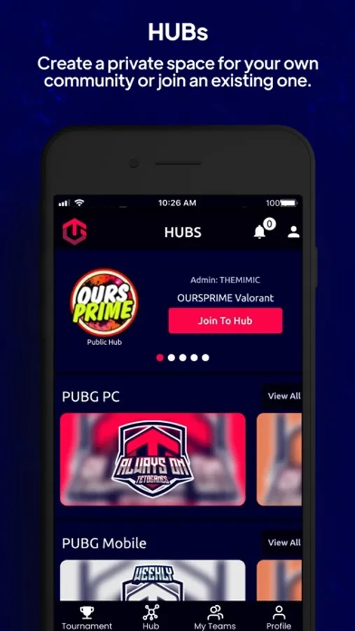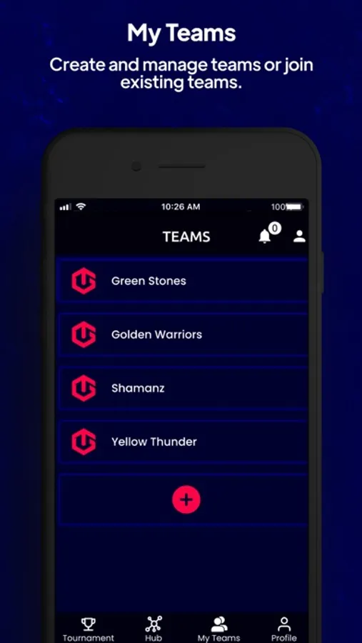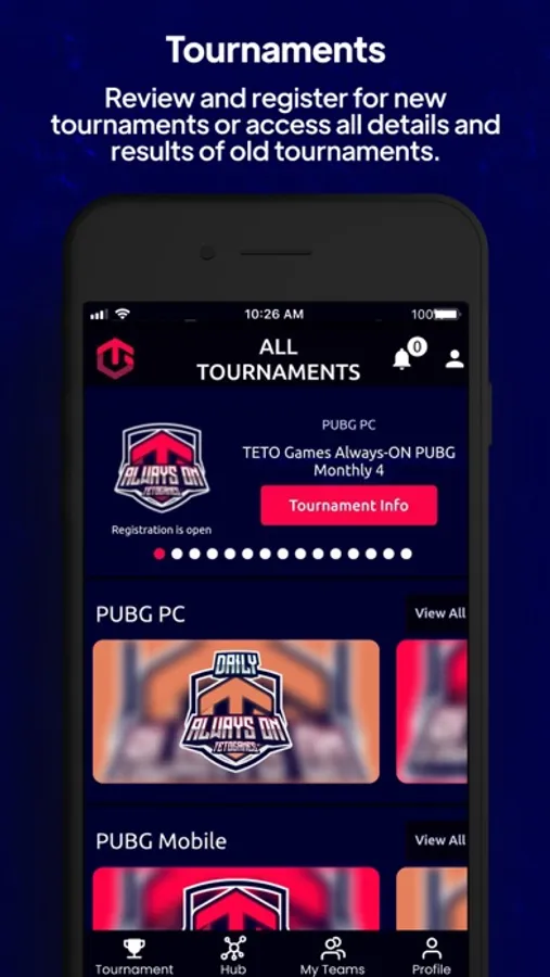 You can register for tournaments as a team, select the roster for each tournament, access team details, players and statistics from past tournaments.