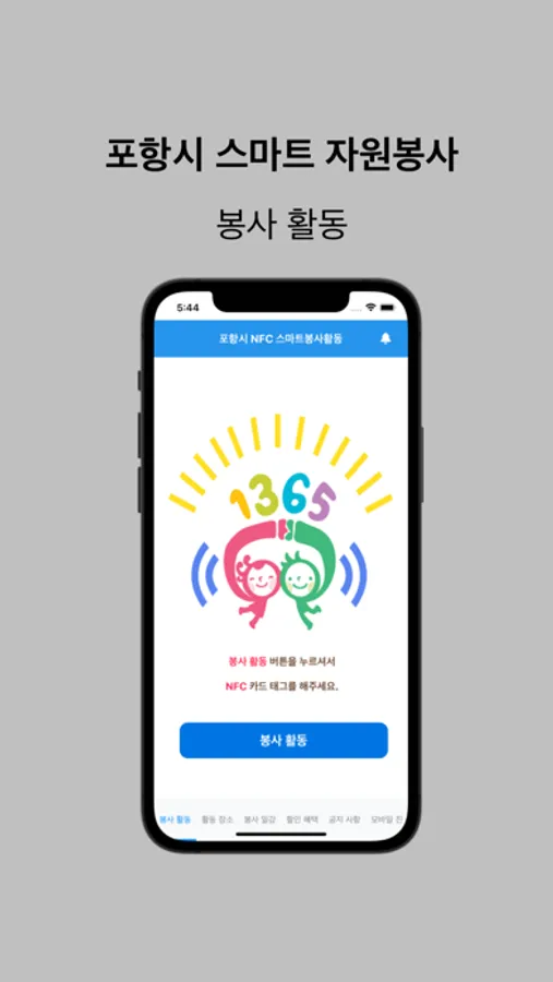 사용할때에는 스마트폰의 NFC 기능이 작동한 상태에서 스마트봉사활동앱을 작동을 시키고