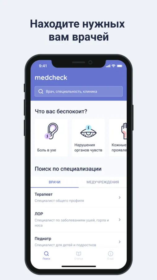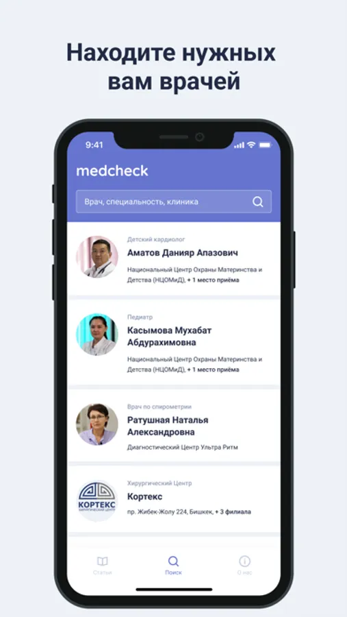 Medcheck - это бесплатное мобильное приложение для быстрого поиска врачей и клиник, а также для получения детальной информации о медицинских работниках и учреждениях.