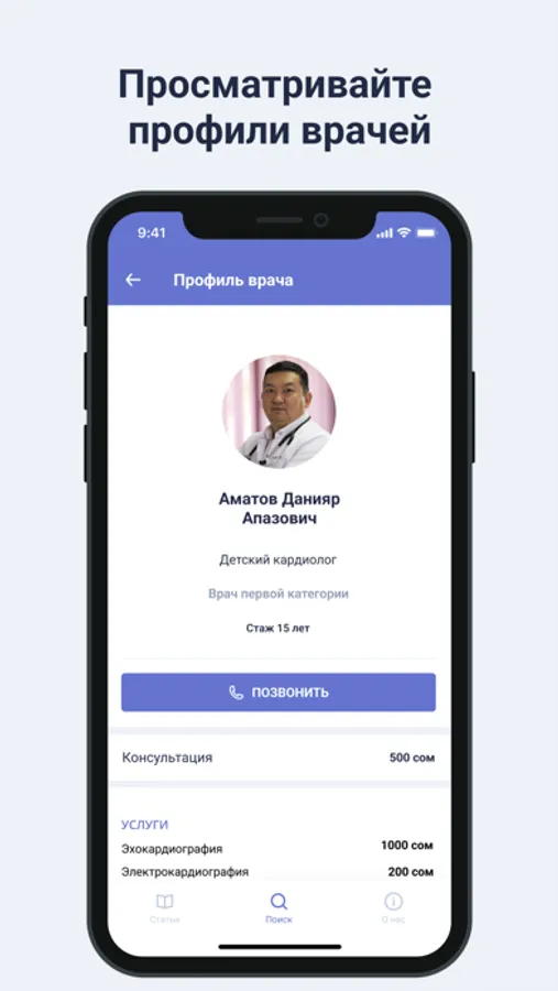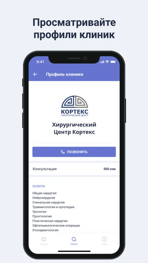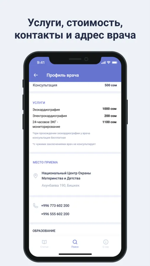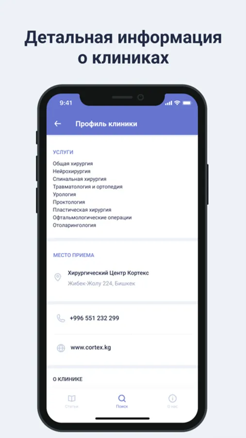 - Предоставить возможность ознакомиться с информацией о профессиональной деятельности врача или специализации клиники, а также получить доступ к их рабочим номерам телефонов, адресам и перечню предоставляемых услуг.