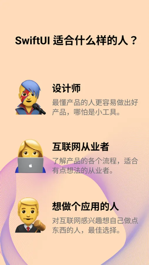 如果你是个设计师,是个互联网从业者,或者自己有想法做点应用,学习技术只是开始,做出自己的产品才是目标。SwiftUI 适合所有对互联网产品有基础常识的人,只要你知道基础的应用控件,知道 NavigationView、Tabbar,Text, Image,就可以很简单的看懂 SwiftUI 的技术代码。