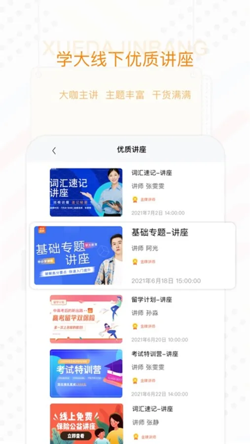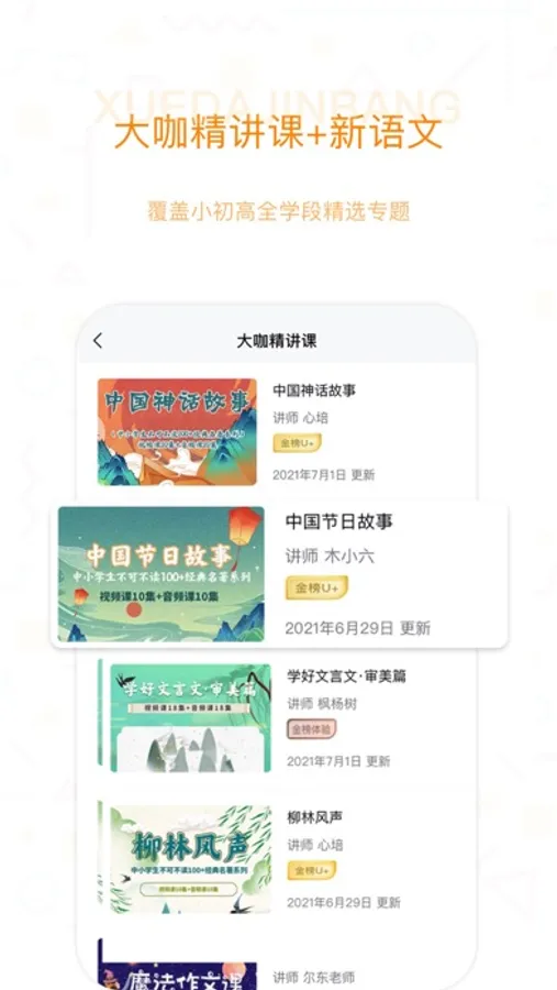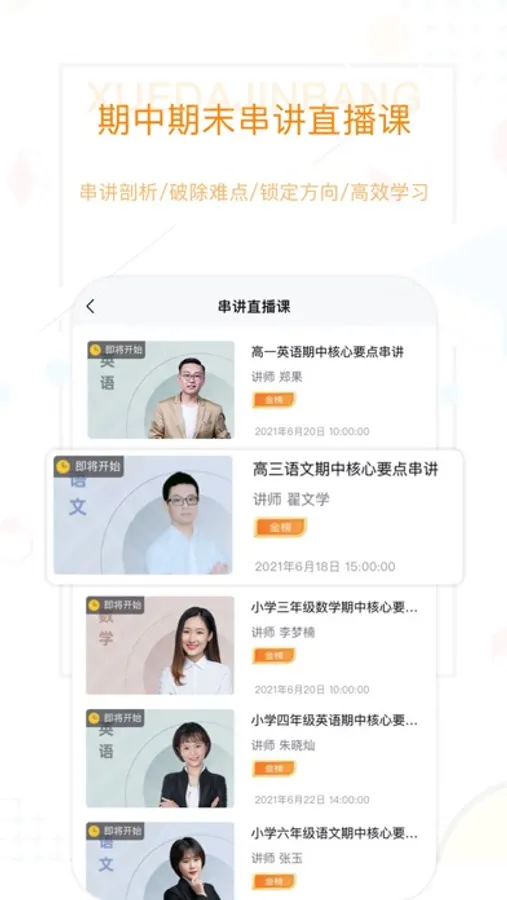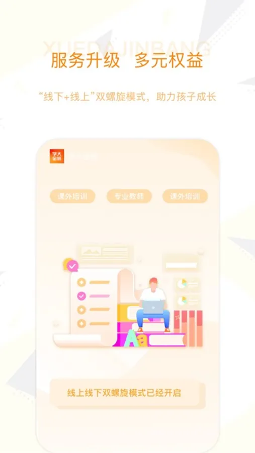 学大金榜是学大教育为学大用户提供的会员服务,项目会员权益包括大咖精讲课、实体金榜学习礼盒、优质文创教辅、期中期末串讲直播、期中期末摸底评测等。