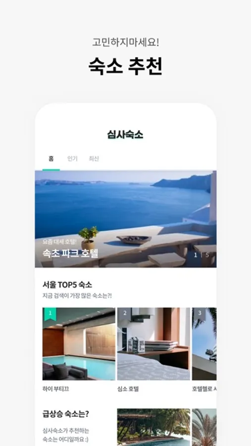 심사숙소는 믿음직한 사진 후기와 여러 가지 필터를 통해 숙소를 좀 더 편리하게 고를 수 있는 서비스를 제공하는 어플입니다.