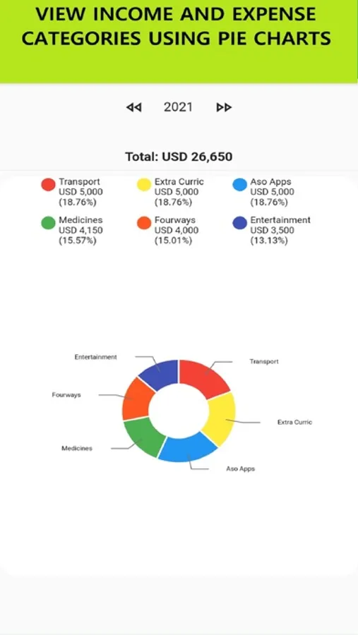 The tracking of all income received and costs incurred is available in diagrammatic form using pie charts.