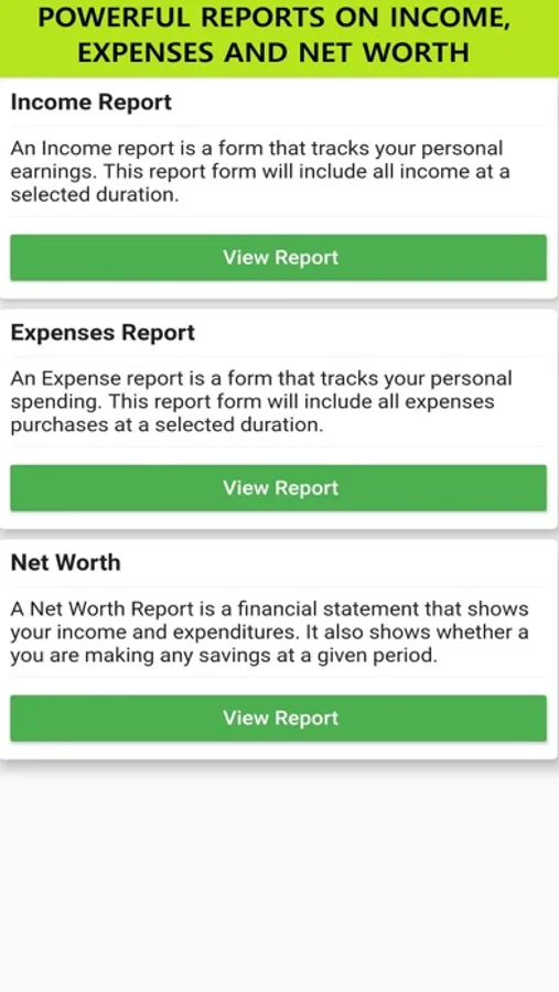 - A net worth report that shows your sources of finance and balances at a point in time. To determine if there is a growth or drop in savings, you simply compare two periods.