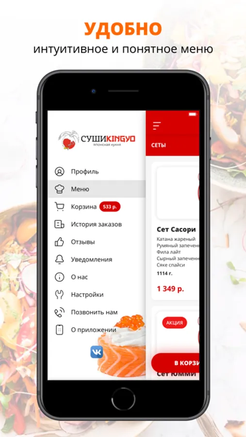 Скачивайте наше приложение и заказывайте готовую еду от СУШИKINGYO с доставкой на дом!