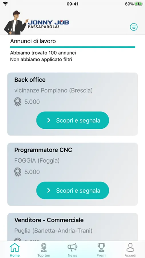 Jonny Job è un’App gratuita che consente di accumulare punti e premi in base alla capacità di segnalare le persone conosciute che si ritengono più linea per gli annunci di lavoro proposti. Il funzionamento è semplice: dopo aver scaricato l’applicazione e creato un proprio profilo, si inizia consultando gli annunci di lavoro che ogni giorno vengono pubblicati nel sistema; è possibile filtrarli per tipologia e per zona geografica. Quando si ritiene di conoscere una persona i cui requisiti professionali siano in linea con la posizione, è possibile inviarne segnalazione. Se la persona indicata accetta di essere ricontattata dal Recruiter, potrà avviarsi il percorso di selezione.