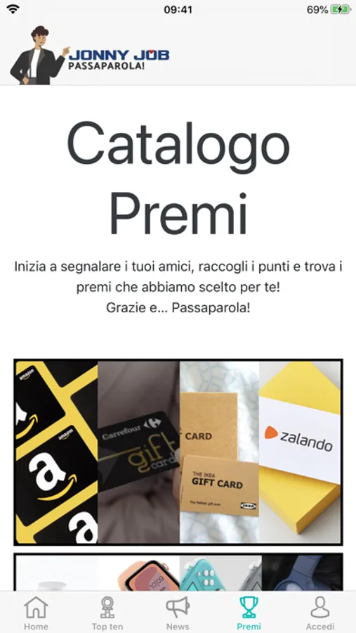 Tutti questi step danno diritto all’accumulo di punti: nel caso in cui il conoscente segnalato venga poi effettivamente assunto, il segnalatore guadagnerà un ulteriore e più cospicuo numero di punti e avrà la possibilità di riscattare il suo premio scegliendo tra le proposte di un ampio catalogo che comprende sia oggetti fisici che card digitali spendibili nei più importanti marketstore italiani. Il segnalatore riceve inoltre un feedback positivo e scala la classifica degli utenti più attivi ed efficaci.