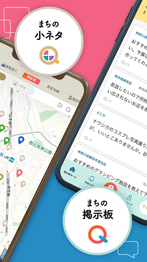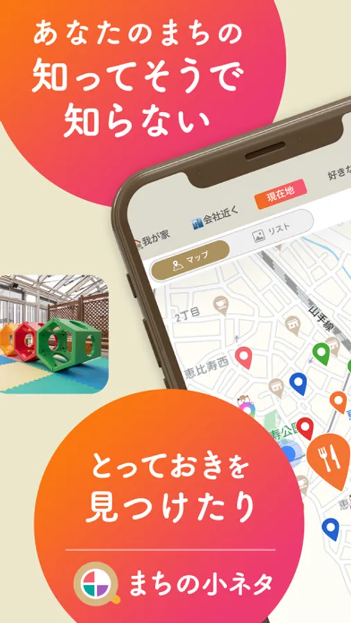 地図をながめて、関心のあるカテゴリーのピンをタップ!気になるスポットはお気に入り登録して、ご近所さんぽの目的地に!