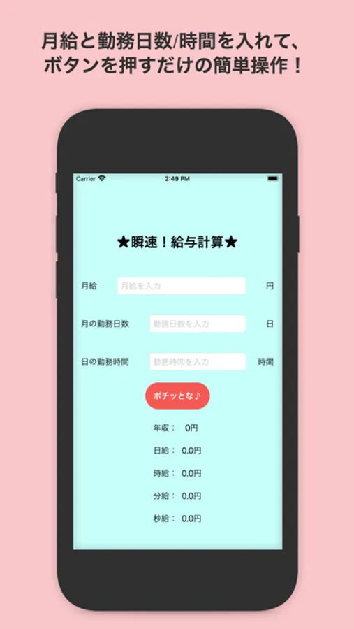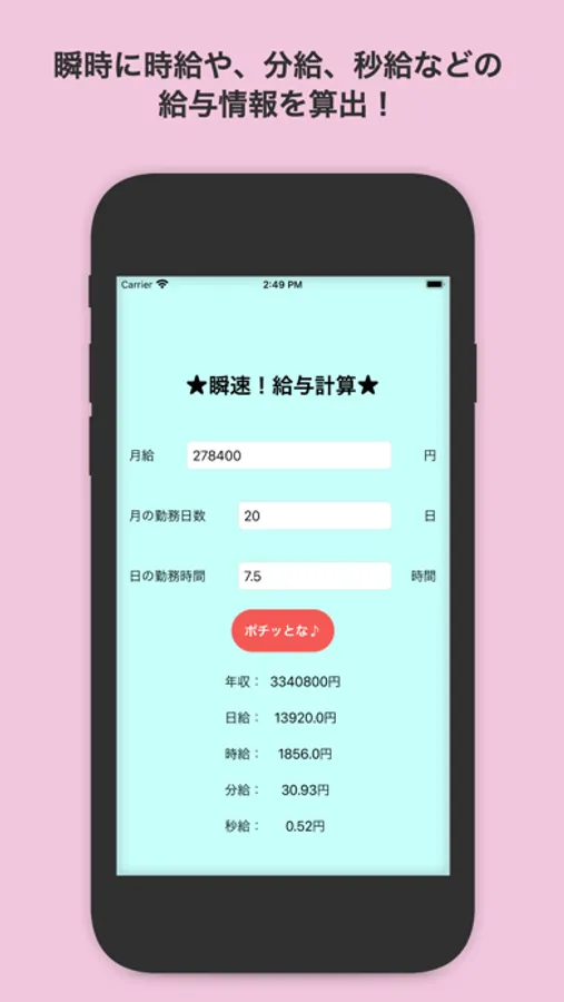 月給、月の勤務日数、月の勤務時間を入力後、ボタンをタップすることで、下記給与情報を算出します。