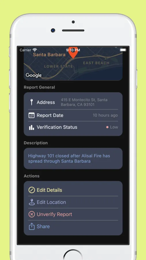 The purpose of this app is to become a public database of issues that are often only sourced from the news. By giving people the ability to report issues and then see real-time updates on its verification level, communities will be informed about things to avoid or be aware of. It also guarantees that problems are not left unheard - your voice is important and makes an impact!