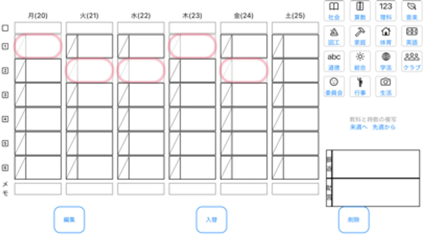 国語、算数、理科、生活、社会、音楽、生活、学活、行事、総合、体育、図工、家庭、委員会、英語、道徳、クラブ