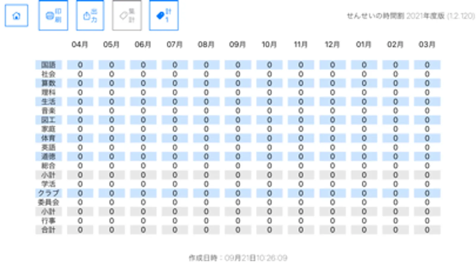 毎日の時間割を入力し、各教科の時間数を自動集計します。