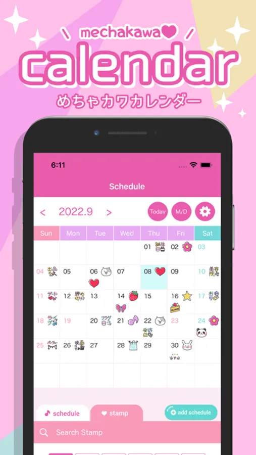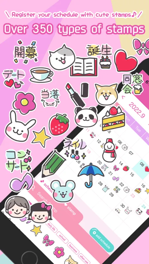It is a simple and cute schedule book app that allows you to easily manage your schedule with a calendar by sticking stamps on it.