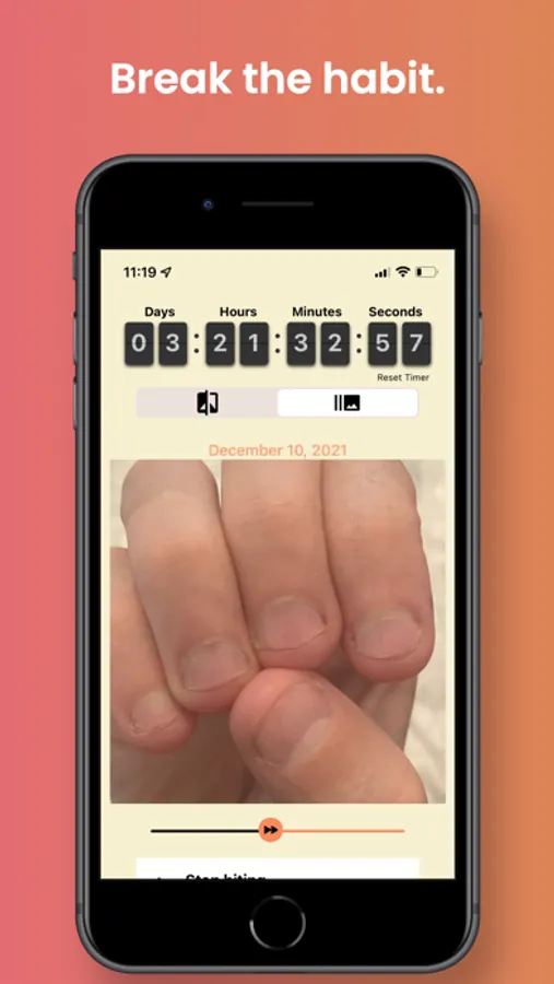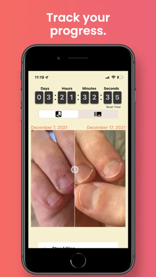 I've suffered from this bad habit for a long time. I tried many different things, but nothing helped me more than seeing my nails in photos. NailKeeper will track your nail growth by showing you a photo comparison and video progression of your nails. Easily track your progress and quit nail picking and biting habit.