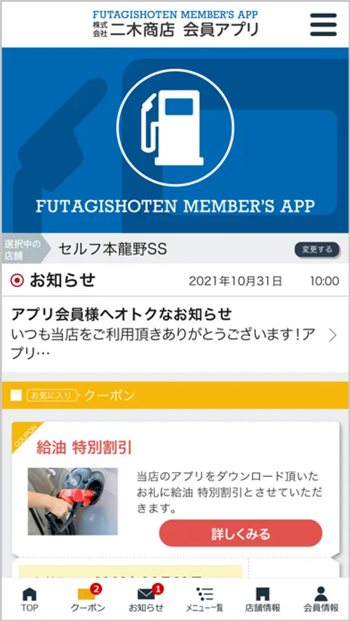 当社の公式アプリ「株式会社二木商店会員アプリ」ではアプリで簡単に洗車・コーティングなどのご予約や愛車のメンテナンス管理が可能の他、当店で利用いただけるお得なクーポンや各種メニューの割引情報を配信しております。