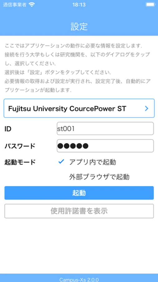 接続先に設定した大学/機関へのログインID/パスワードを使って本アプリで