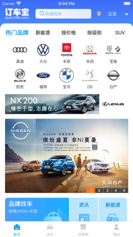 首页-按类型品牌等切换车型、显示各模块入口,资讯列表。方便用户快速了解应用主要功能。
