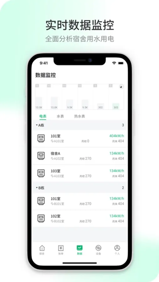 7. 支持查看各个宿舍和员工实时的水电表数据