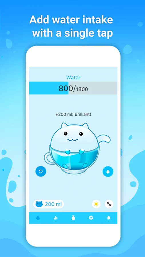 Watercat saves your time: one short tap - and your water intake is saved, long press - and you can change the volume of liquid you drank.