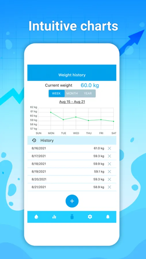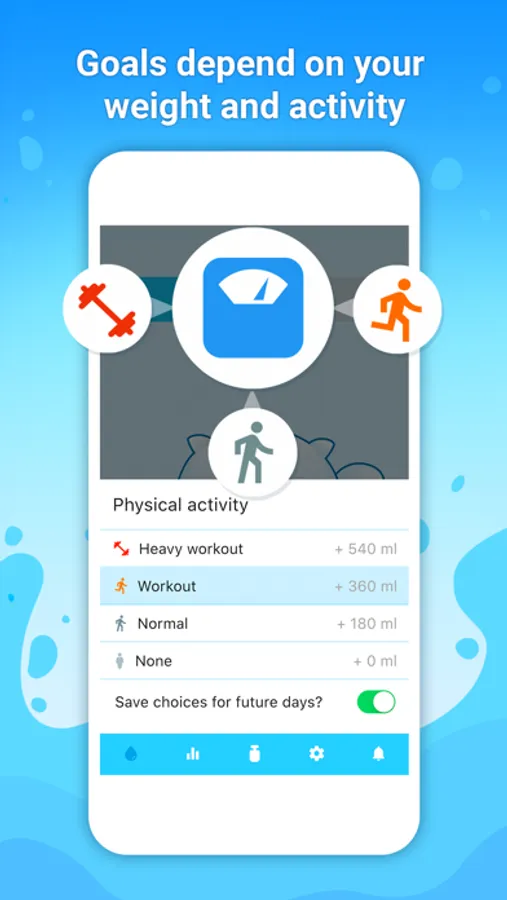 The app will automatically calculate how much water you in particular need to drink with consideration to your gender and weight, moreover it will make adjustments based on the weather conditions and your physical activities.