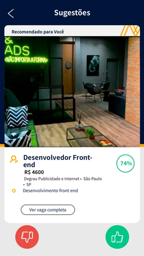 Na palma da sua mão, você terá acesso a vagas e oportunidades de trabalho em qualquer lugar do Brasil, e quem sabe, futuramente, do mundo. Vagas que são compatíveis com o que você está buscando, compatíveis com seu perfil, experiências e formação, candidatura de forma simples, cadastro fácil e com apenas um toque para você dar “MATCH” com aquela oportunidade de trabalho que tanto busca.