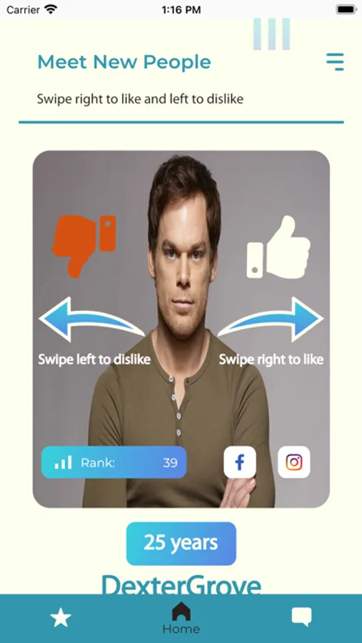 Welcome to Ranked- on this app swipe right if you want to chat and get to know someone or simply swipe left if you rather not. If you like someone and they liked you back you can chose to not only chat with them but connect with them on their other socials as well.
