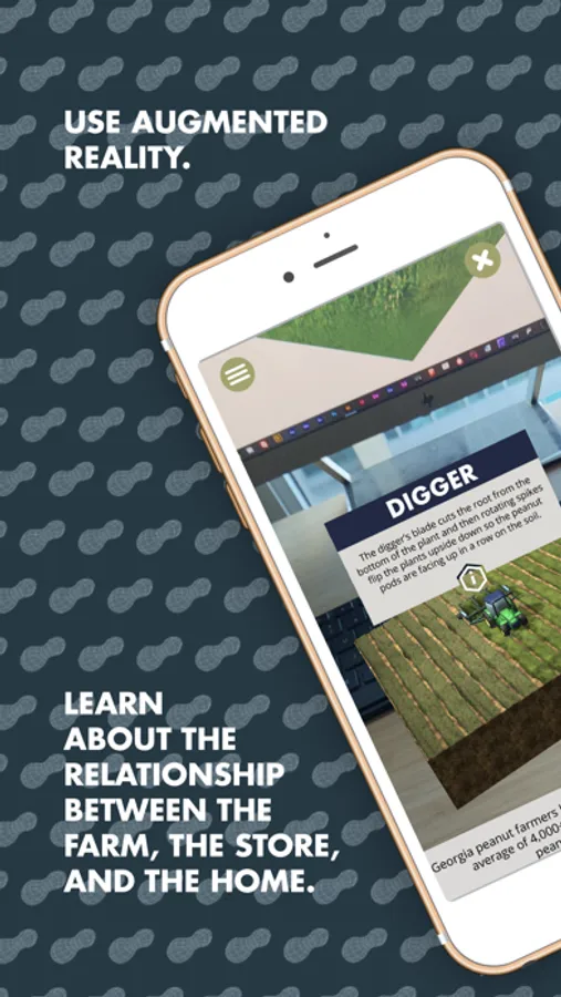 The Georgia Farm Bureau presents an augmented reality for youth to learn about the farm to plate journey of one of the longest standing staples in the country, the peanut. Divided into two trios of AR experiences, peanut and horticulture, learn about the relationship between the farm, the store, and the home.