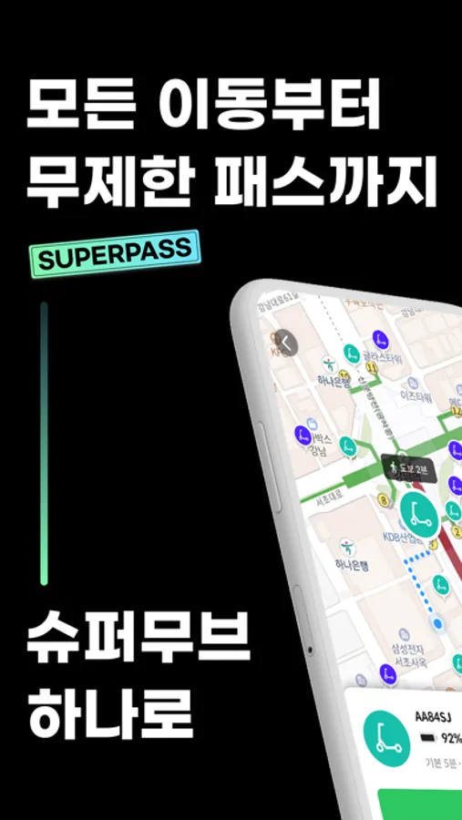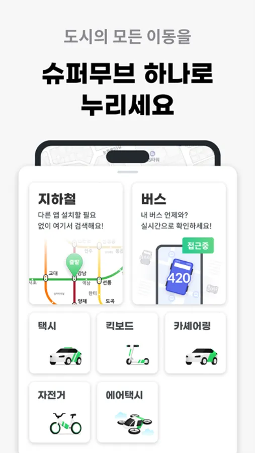 버스, 택시, 킥보드, 자전거를 슈퍼무브 하나로 해결하세요.