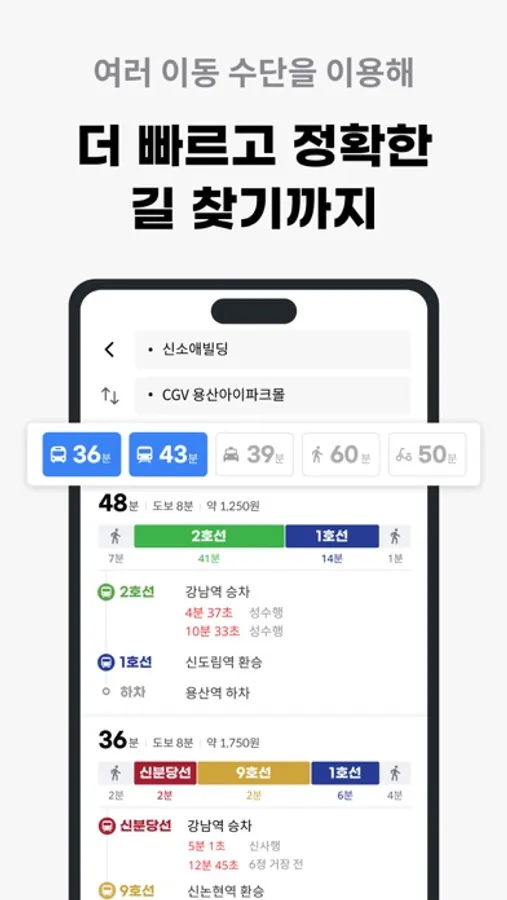 - 다양한 이동 수단으로 빠르고 편리한 경로를 추천받을 수 있습니다.