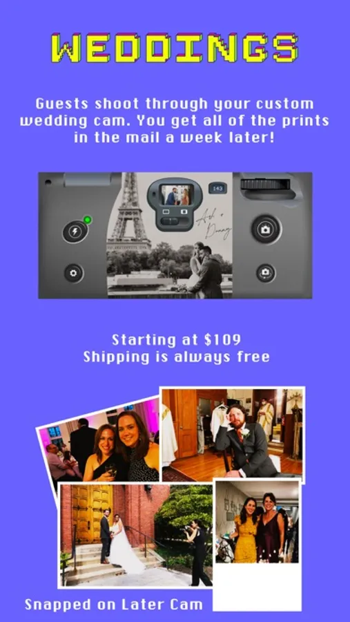 You'll get a custom wedding cam design, guests can access your cam using a QR code and a week after your wedding, you'll get all the photos in the mail!
