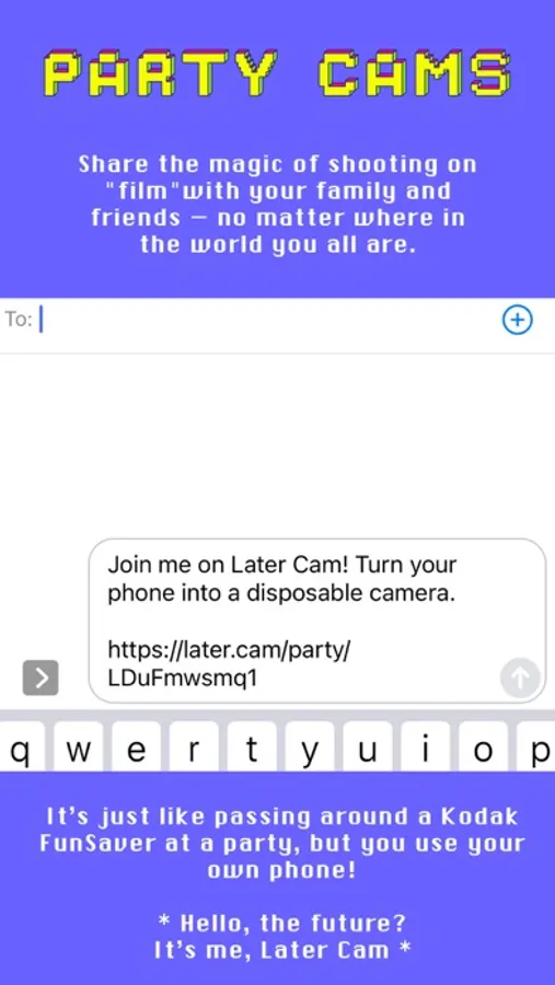 It’s just like passing around a Kodak FunSaver at a party, but you use your own phone! * Hello, the future? It’s me, Later Cam *