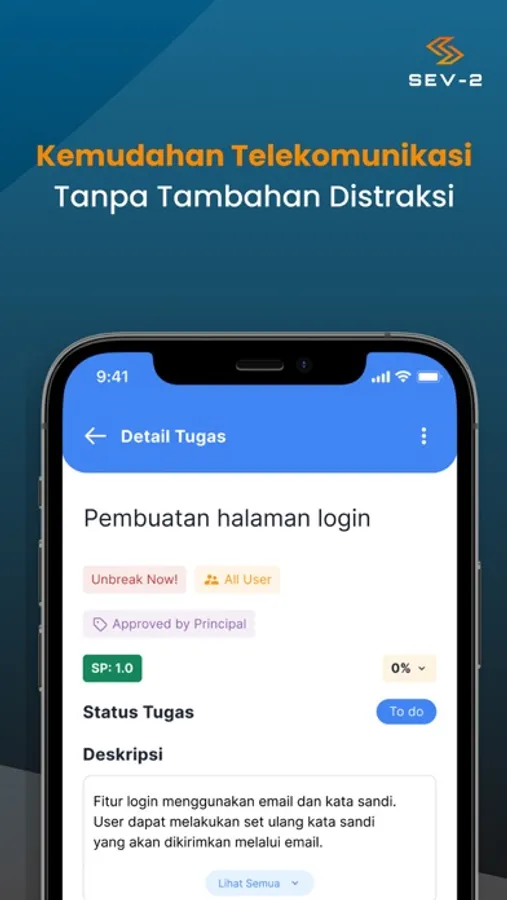 SEV-2 membawa satu solusi untuk membuat komunikasi dan kolaborasi tim anda bersama pemangku kebijakan dengan lebih efektif. Kami membuat kerja anda lebih efisien dan lebih mudah, baik anda bekerja dalam korporasi besar atau bisnis kecil. Satu platform yang bisa memenuhi kebutuhan anda mulai dari to-do list, manajemen proyek, kalender, dan monitoring kerja lebih mudah.