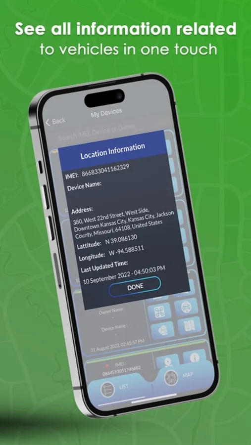 • Get details about the vehicle in use such time of journey, GPS Battery level & signal strength
