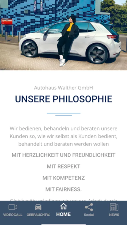 Mit unserer Volkswagen Walther App sind Sie immer bestens informiert und mit der integrierten Push-Funktion erhalten Sie unsere neuesten Angebote und News, können ganz einfach und unkompliziert mit unseren Mitarbeitern videochatten und rund um die Uhr sämtliche Informationen zu unseren Fahrzeugen abrufen. Beim uns bekommen Sie alles aus einer Hand. Mit Respekt, Kompetenz und Fairness.