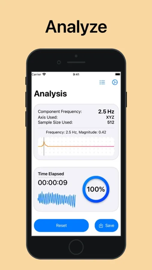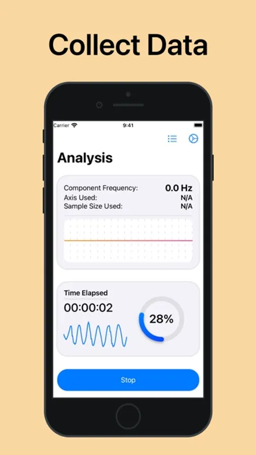 Simply press the start button to start collecting accelerometer data. Once enough data points have been collected, Tremor Analysis automatically performs a Fast Fourier Transform (FFT) which outputs the component frequencies and magnitudes.