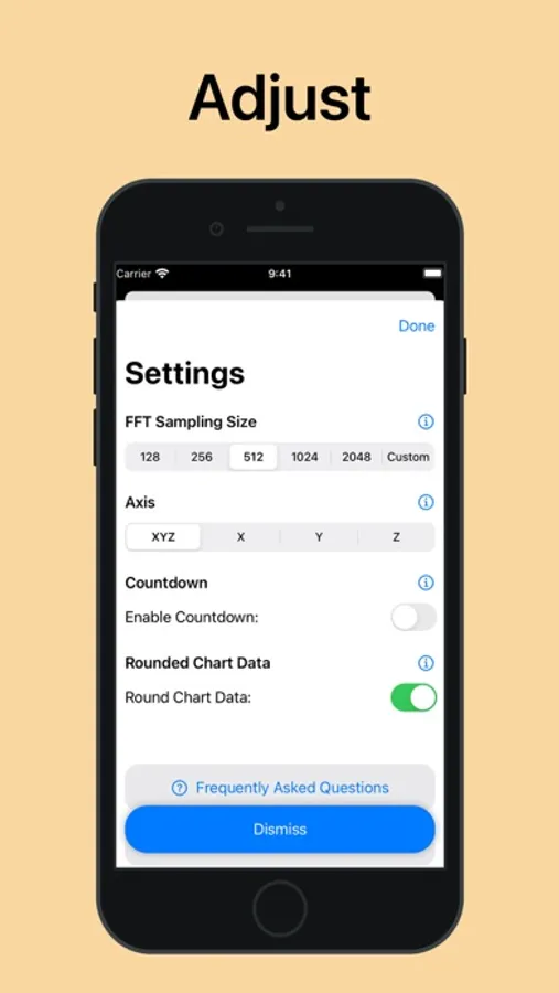 Customize the app by choosing the number of data points you would like to collect, which axis to collect accelerometer data from, and whether you would like to see rounded or precise data.