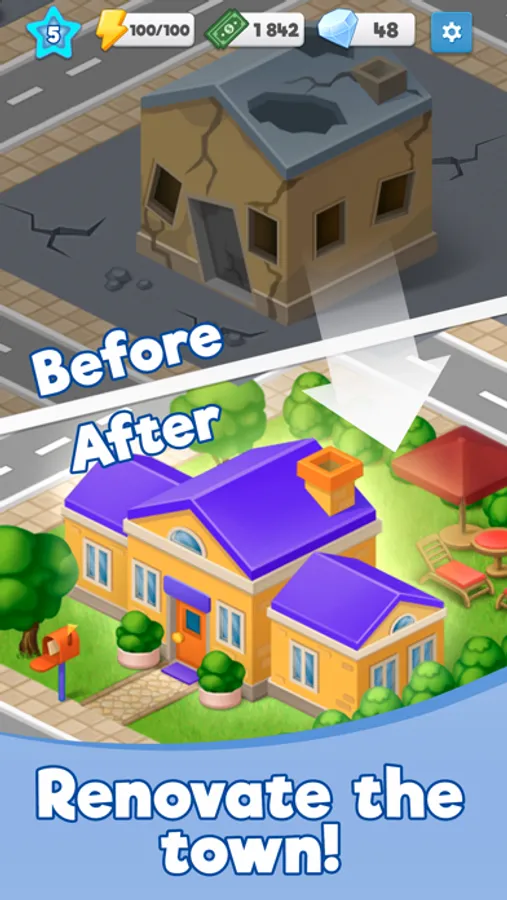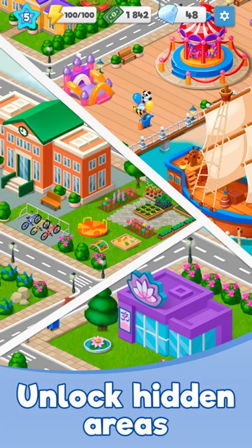 Discover the town's secrets as you unlock the mysterious areas that were destroyed in the earthquake and restore them from the ground up. Gain experience by completing tasks and discovering new items to merge, while leveling up to become Riverside’s master builder. You’ll have so much fun solving Riverside’s many puzzles.