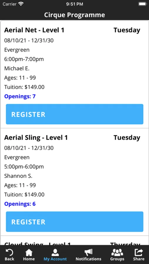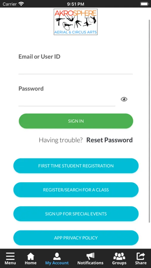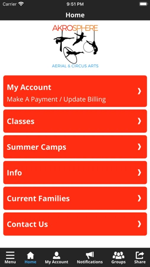 The Akrosphere app allows you to manage your account with ease: register for classes, manage your payments, check your studio email, and more. You'll also receive important notifications about inclement weather closings, registration openings, special announcements, and upcoming events.