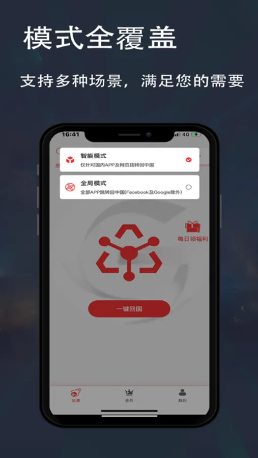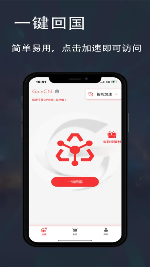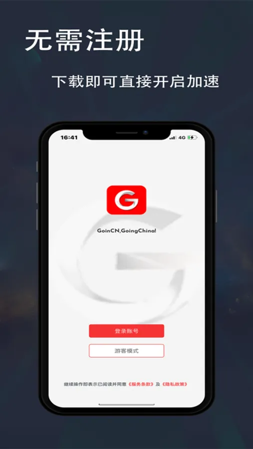 GoinCN加速器是一款集海外回国看视频加速,音乐加速,app加速,网站加速,免费加速,解决影音各种观看问题于一体的多功能无套路回国加速器app