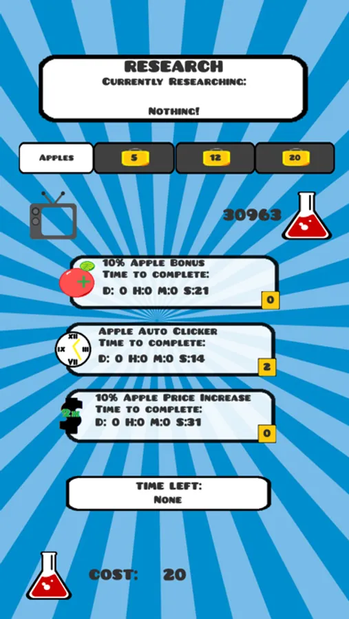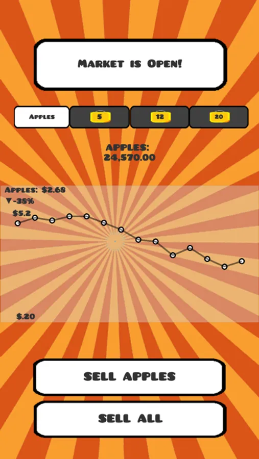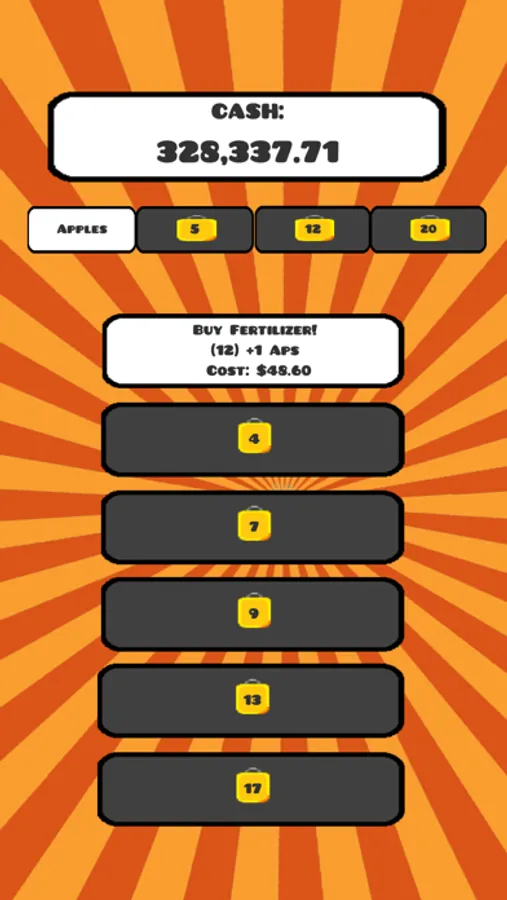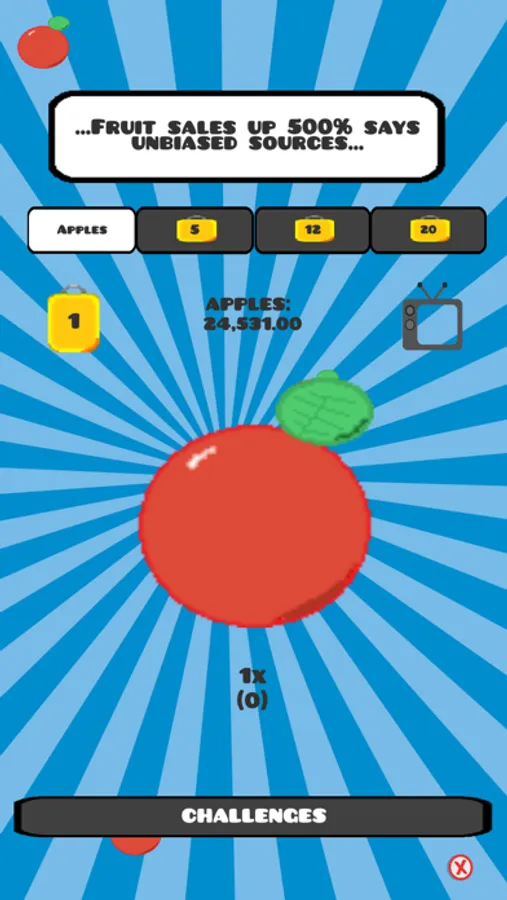 A fruit filled adventure for all ages! Click on some apples, and sell some apples! Featuring a in-game market, you choose when to sell your fruit! Timing the market has never been so much fun! Research some boosts to help with the process and buy upgrades to expand your fruit empire! Innovate your fruits to fuel your growing R&D department.