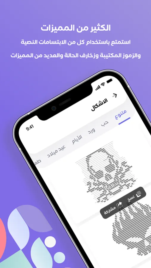 ٧-امكانية نسخ او مشاركة اي من الزخارف العربية والانجليزية والرموز والاشكال الجاهزة على جميع التطبيقات المثبتة داخل التطبيق وخصوصا شبكات التواصل الاجتماعي مثل فيس بوك وانستجرام وواتساب وغيرها.