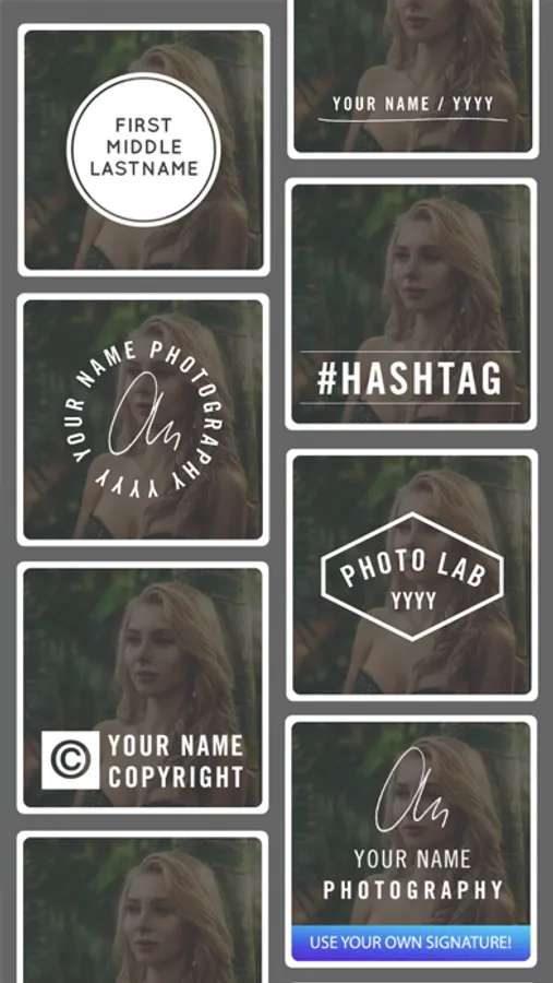 Create your own watermark easily with our vast library of fonts, clip art, and colors, and lots of templates with signature, copyrights, trademark, stamps, date-time, location, social icons, hashtag, name and many more unique designs